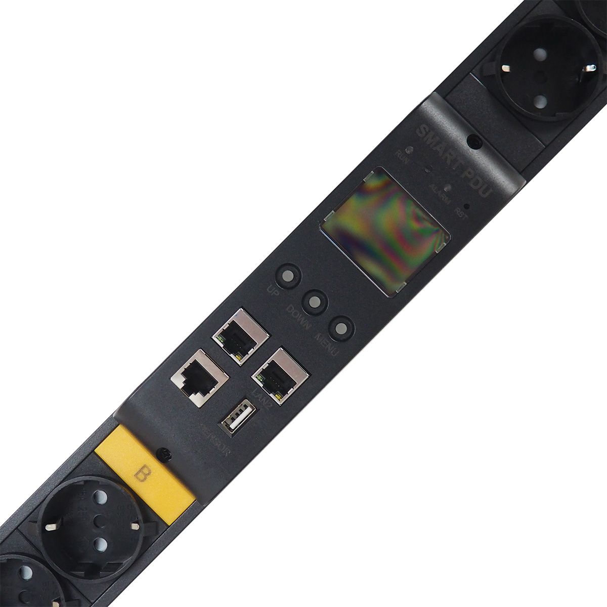 Встроенный экран контроллера PDU позволяет визуально отслеживать состояния розеток, датчиков, подключенных внешних устройств.