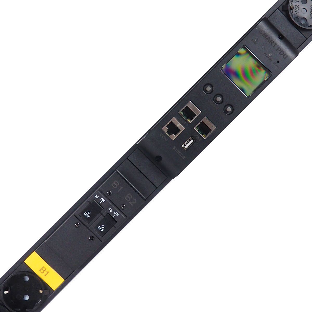 Встроенный экран контроллера PDU позволяет визуально отслеживать состояния розеток, датчиков, подключенных внешних устройств.