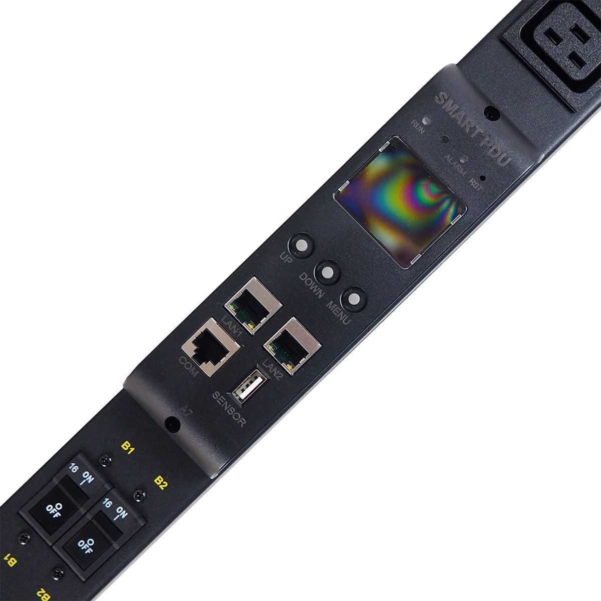 Встроенный экран контроллера PDU позволяет визуально отслеживать состояния розеток, датчиков, подключенных внешних устройств.