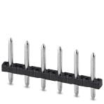 Штыревой разъем, номинальный ток: 12 A, расчетное напряжение (III/2): 320 В, номинальное сечение: 1,5 мм², полюсов: 5, размер шага: 5 мм, цвет: черный, поверхность контакта: олово, монтаж: THR пайка, расположение выводов: Линейное расположение выводов, длина выводов [P]: 3,5 мм, Максимальный ток зависит от используемого разъема. Учитывается самой низкое из значений тока для разъема и штыревой планки. Штыревая колодки изготавливаются из стойкой к высокой температуре пластмассы и, таким образом, допускают монтаж пайкой оплавлением припоя.