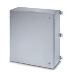 Клеммная коробка, mатериал: Высококачественная сталь 304 / 1.4301, поверхностное сопротивление: сатинированный, cеребристый, 600 мм x 650 мм x 240 мм, тип замка: Дверь со сменным шарниром, комплект поставки - ATD: Дверной шарнир с затвором на четверть оборота, Монтажная плата, ключ с двумя бородками, Крепежный кронштейн в комплекте с винтами, Штифты заземления M12, расположенные снаружи, Инструкция по монтажу, Дверной шарнир с затвором на четверть оборота
